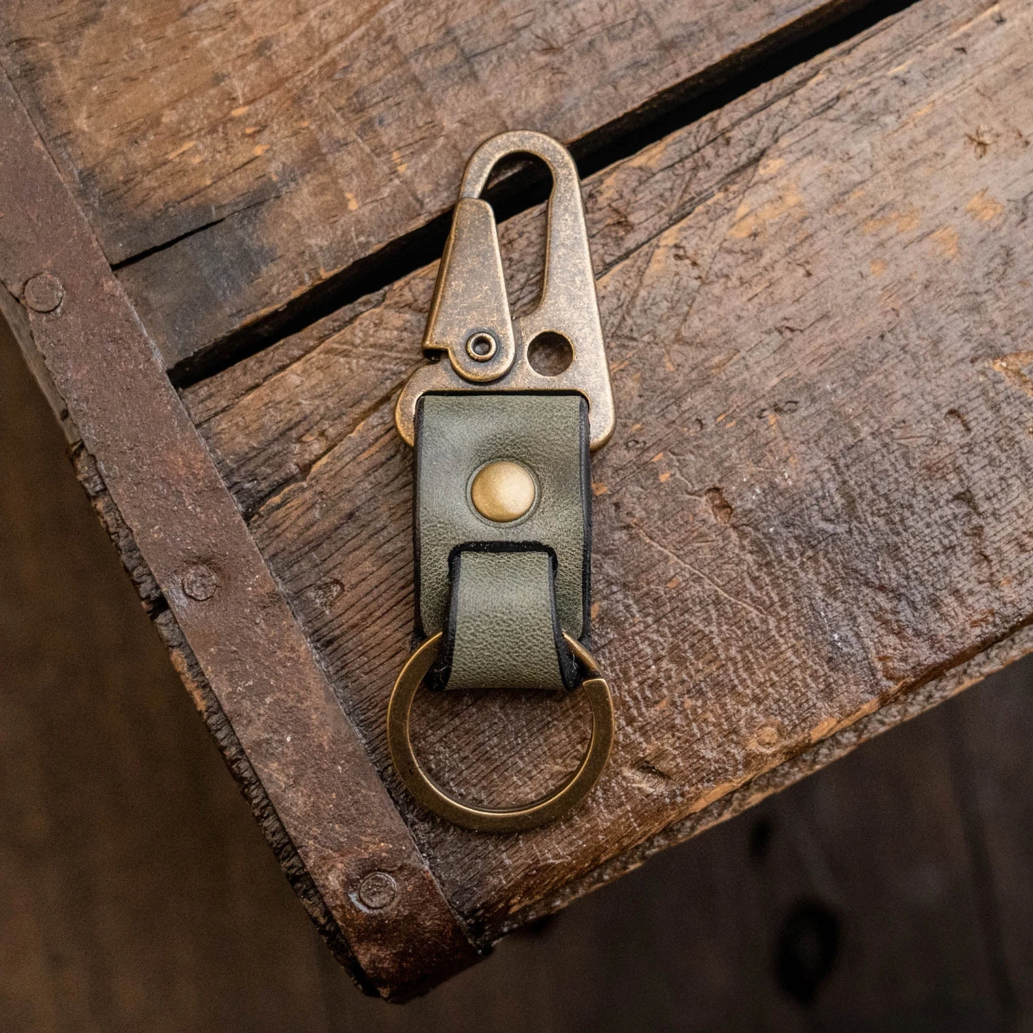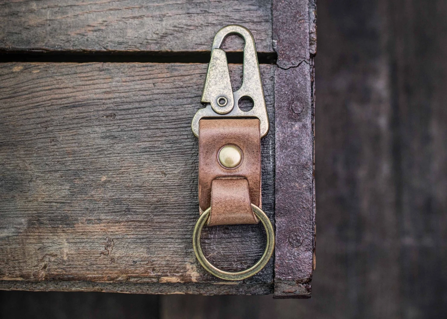 Handcrafted leather gear made using traditional methods, Wickett and Craig Full Grain Leather, straight from a family owned and crafted small business, the Ace is a handmade leather keychain with choice of matte black or antique brass key snap, secured with a rivet.