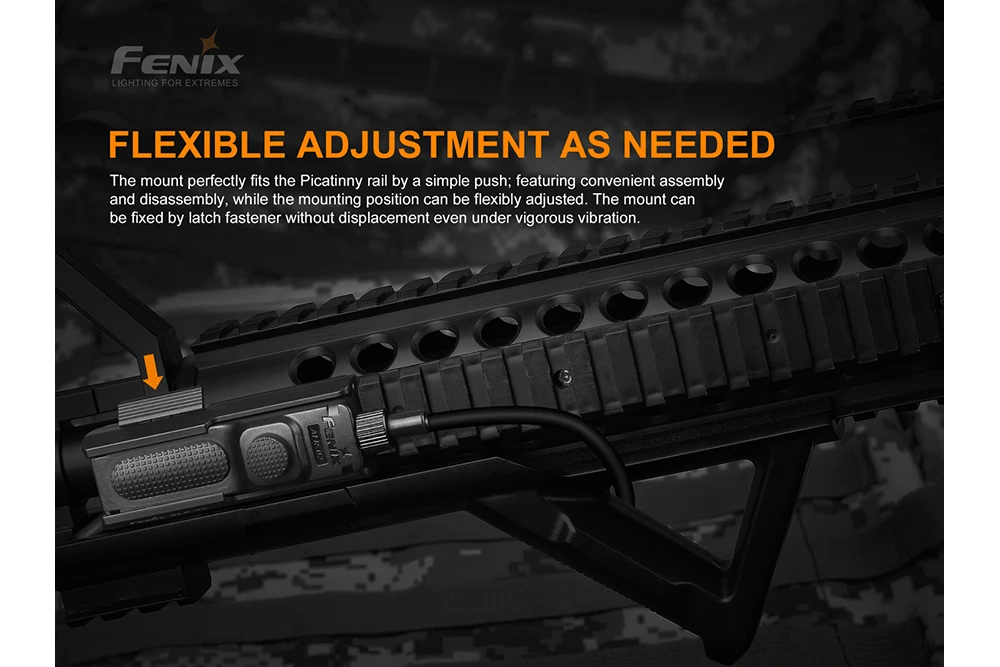 The ALG-05 is crafted from aluminum alloy with a matte black finish for maximum concealment and a secure attachment to any Picatinny rail. Upgrade your tactical setup with the Fenix AER-03 V2.0 + ALG-05 Tactical Kit today!