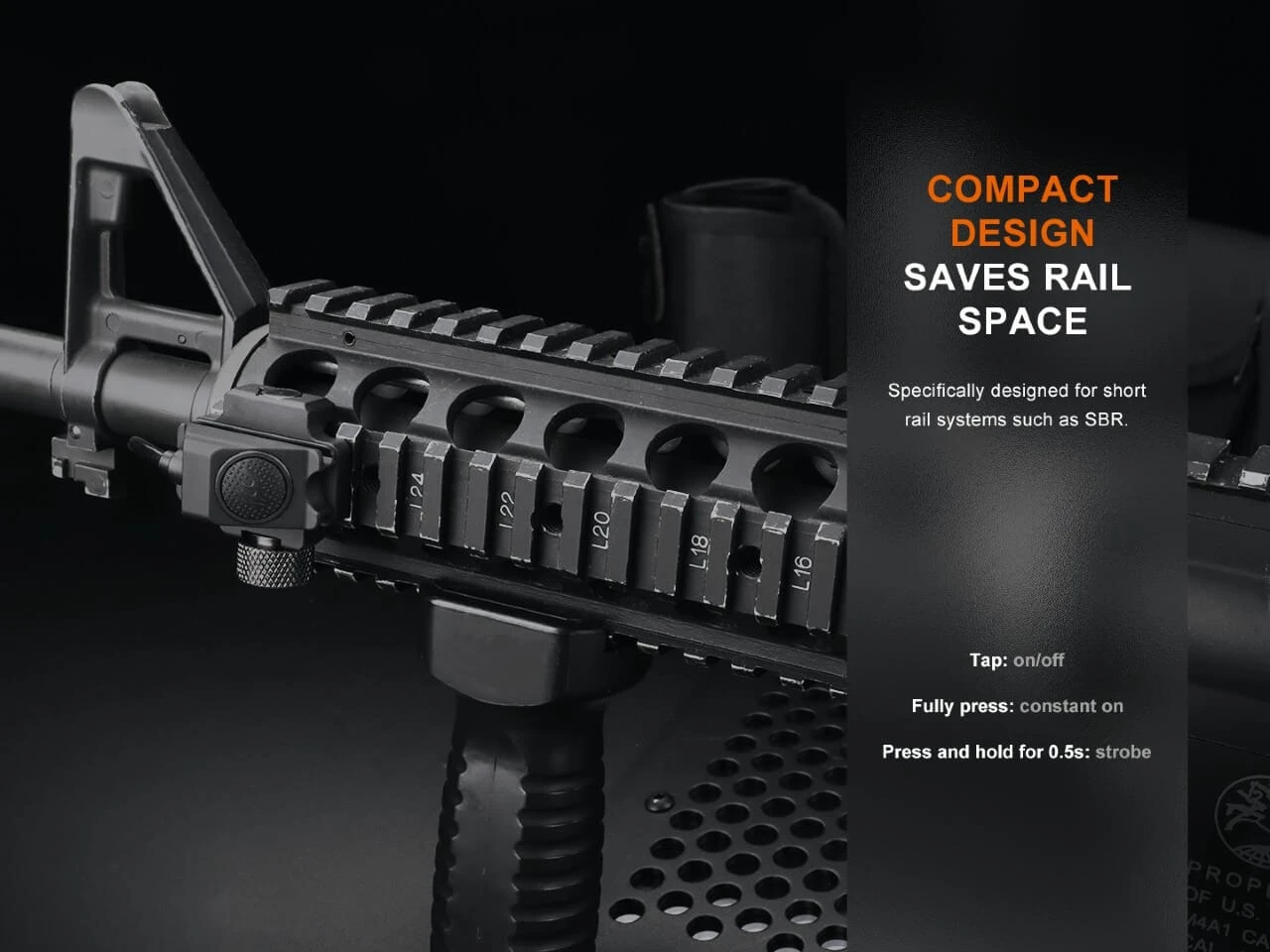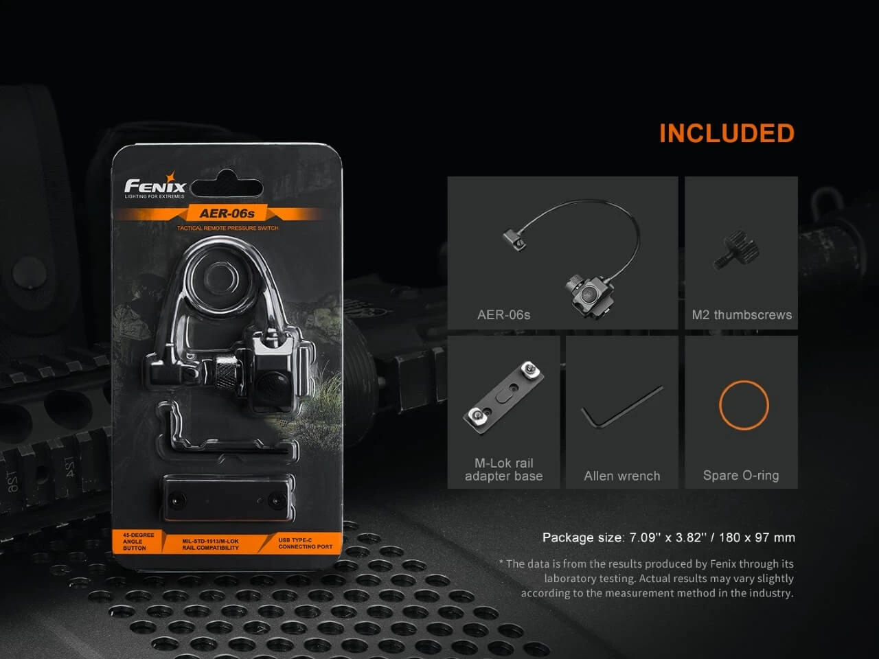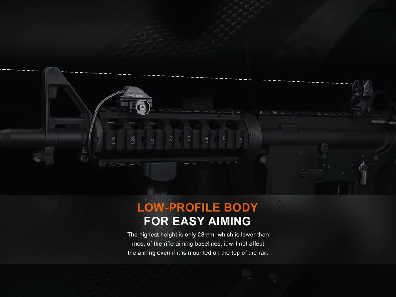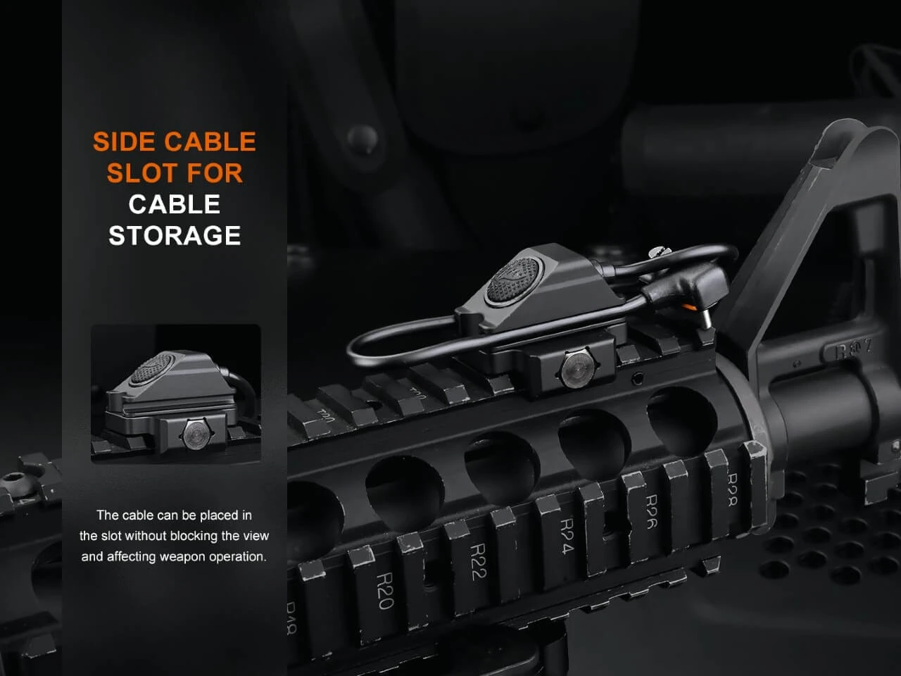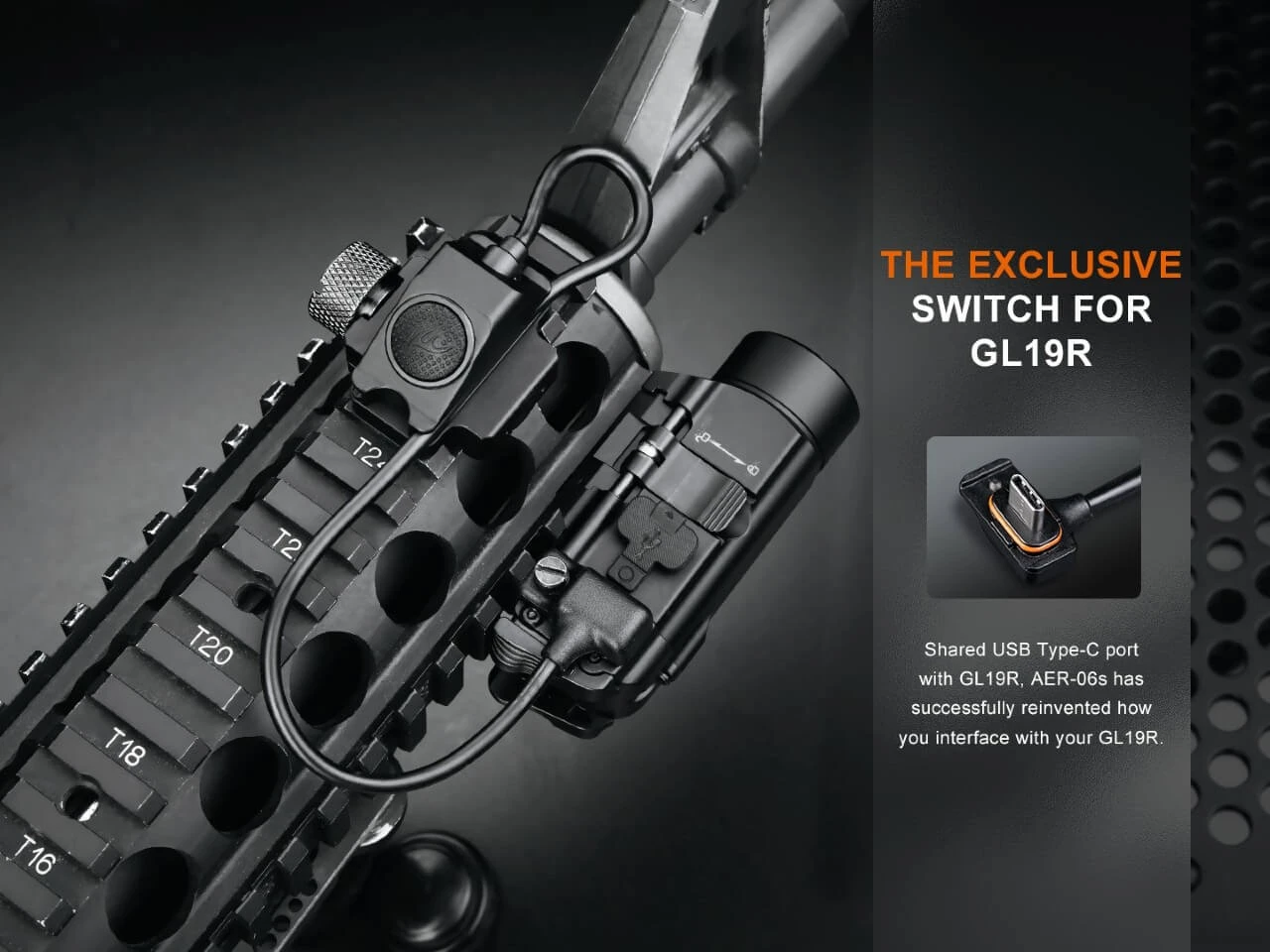 The AER-06S is perfectly designed for the GL19R Tactical light, to allow remote activation and use of the light while mounted on your weapon. It includes two separate bases, compatible with MIL-STD-1913 or M-Lok rails and features a 45-degree angle button, allowing for smooth and simple ease of use in a variety of grip placements. Additionally, the AER-06S low profile of only 28mm means that it won’t get in the way of your sights, no matter where you have it mounted. The switch plugs directly into the USB-C port on the GL19R, so there are no complicated attachment requirements. Even storage is convenient with the built-in cable storage slot to keep the wire clear while you aren’t using your weapon light! You couldn’t ask for a better companion for your GL19R than the AER-06S Tactical Pressure Switch.