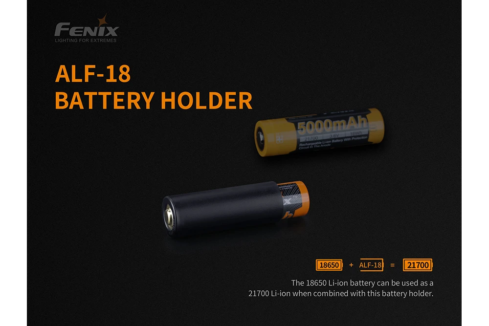 Want to use your rechargeable 18650 batteries in your 21700 flashlights? No problem, with the ALF-18 Battery holder. Slide your 18650 battery inside the ALF-18 battery holder sleeve, and your battery will now be the size of a 21700, so you can use it quickly and effortlessly in your flashlight.