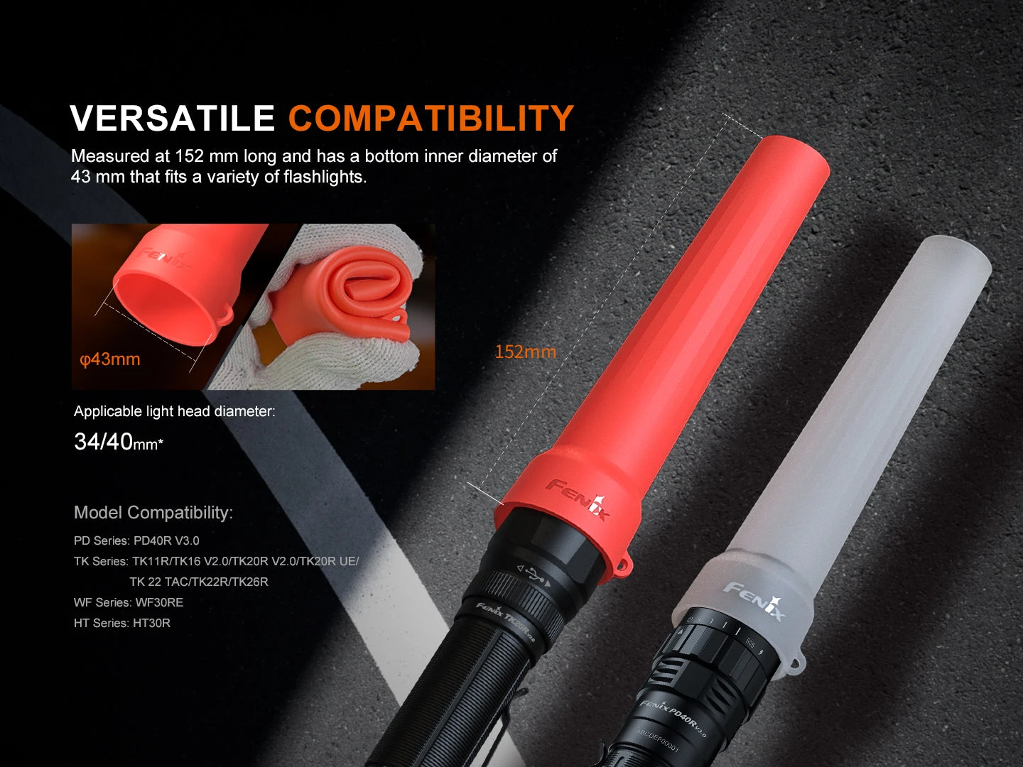 The Fenix AOT-04 Silicone Traffic Wand is a versatile and durable attachment designed to enhance the functionality of your Fenix flashlight. With an internal diameter of 43mm, it fits flashlights with head sizes of 34mm or 40mm, providing flexibility across multiple models. At 152mm long, this traffic wand is compact yet highly visible, making it ideal for a range of applications such as traffic control, law enforcement, construction site management, and even for creating soft lighting in low-visibility environments. Its innovative silicone design allows it to easily roll up for storage, saving valuable space in your gear bag while maintaining reliable performance when needed. Whether you’re managing safety on the road or coordinating a construction project, the AOT-04 provides the dependable illumination and control required for the task.