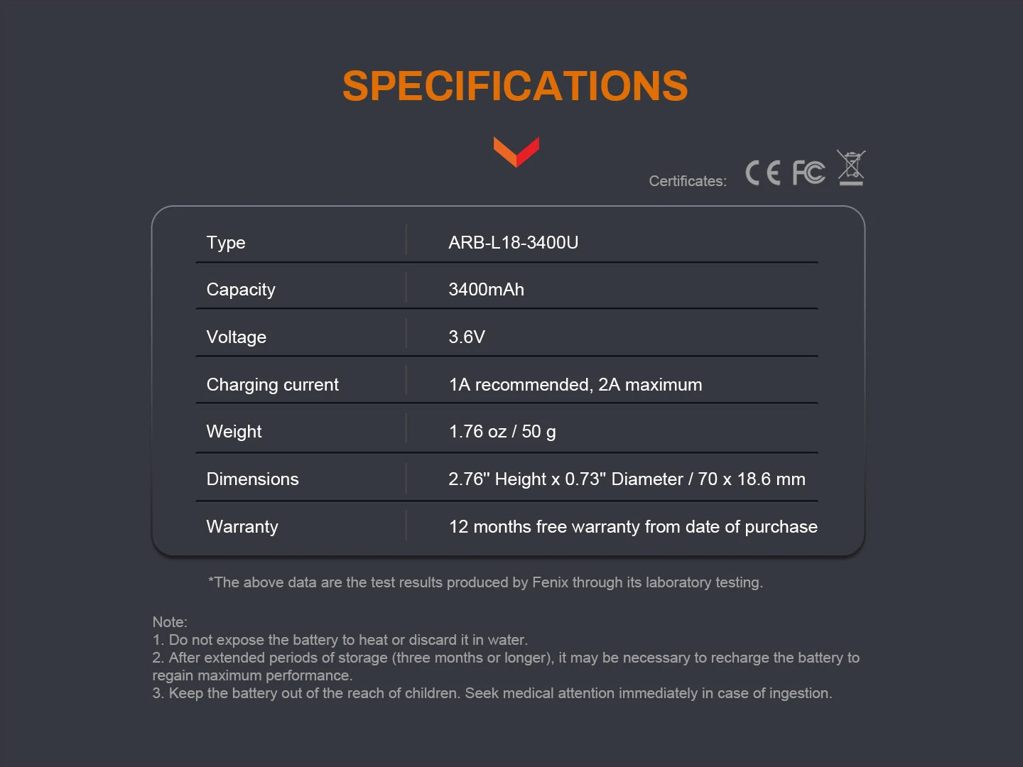 The Fenix ARB-L18-3400U USB rechargeable lithium-ion battery features a built-in USB port to charge without the need for an external charger, though one can be used if desired. Its anode circuit is specially encased in a steel housing, reducing the risk of short-circuiting from impact or collision due to the fully wrapped steel construction.