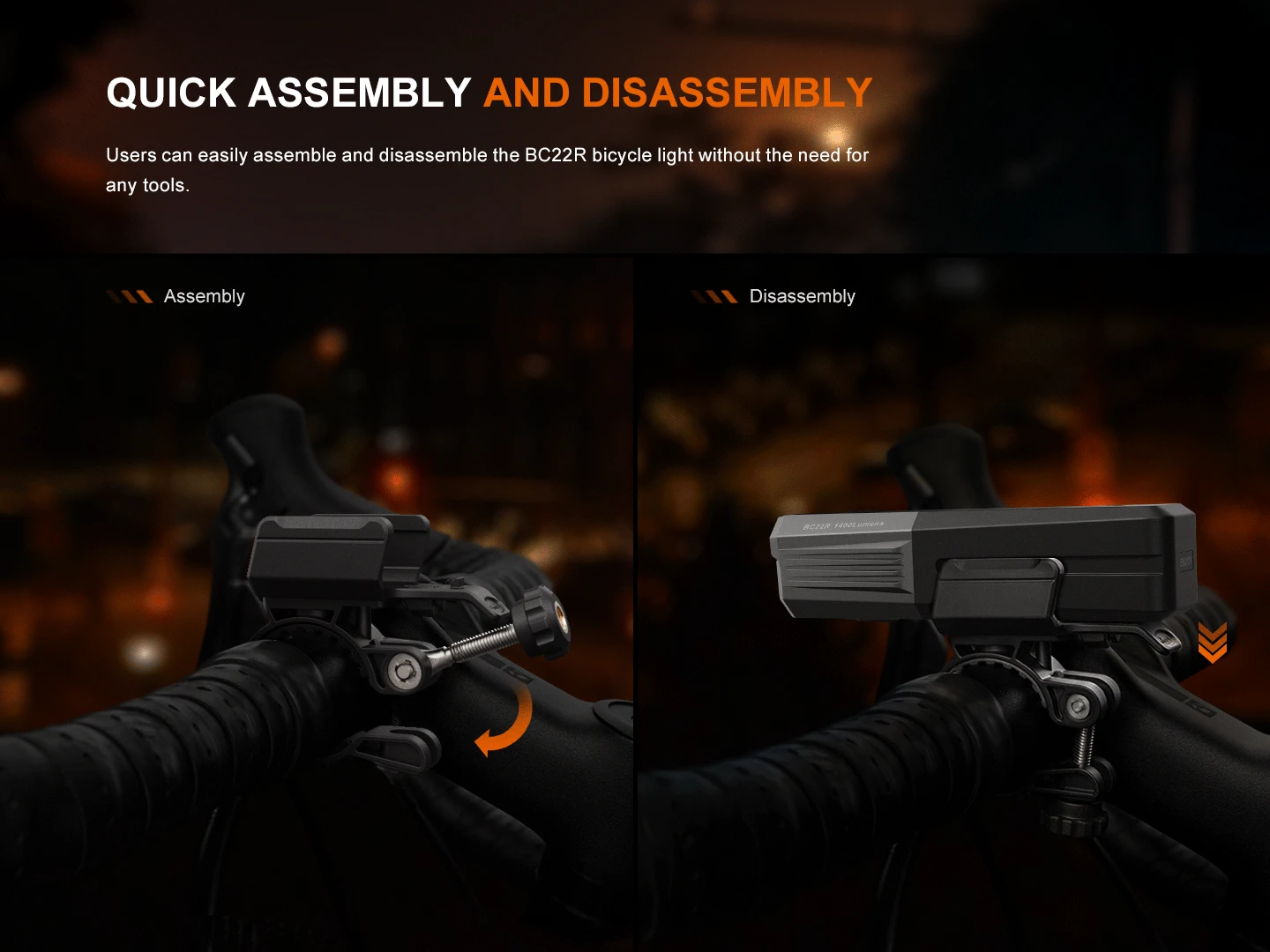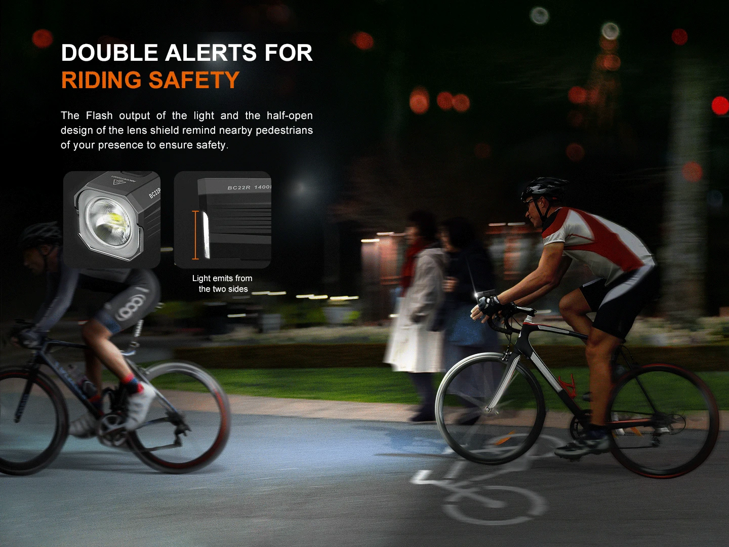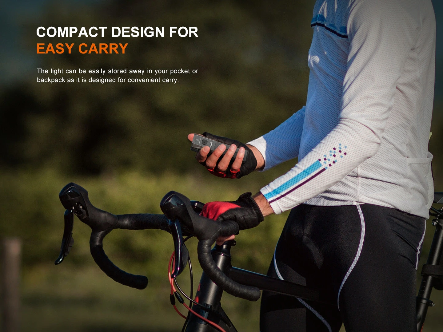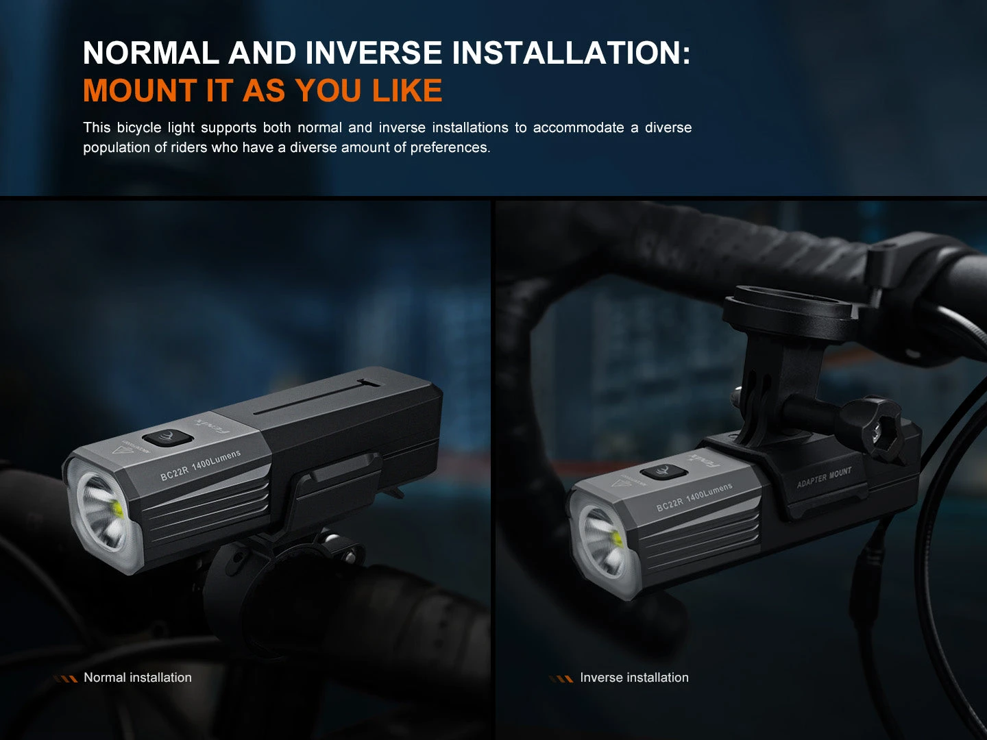 The Fenix BC22R High-Performance Road Bike Light delivers a powerful 1400-lumen output with a broad 512-foot flood beam, ensuring clear visibility while its anti-glare cut-off line protects pedestrians and oncoming traffic for your safety and theirs. Compact and aerodynamically designed, it mounts easily on the top or bottom of handlebars with a quick-release system for effortless use.