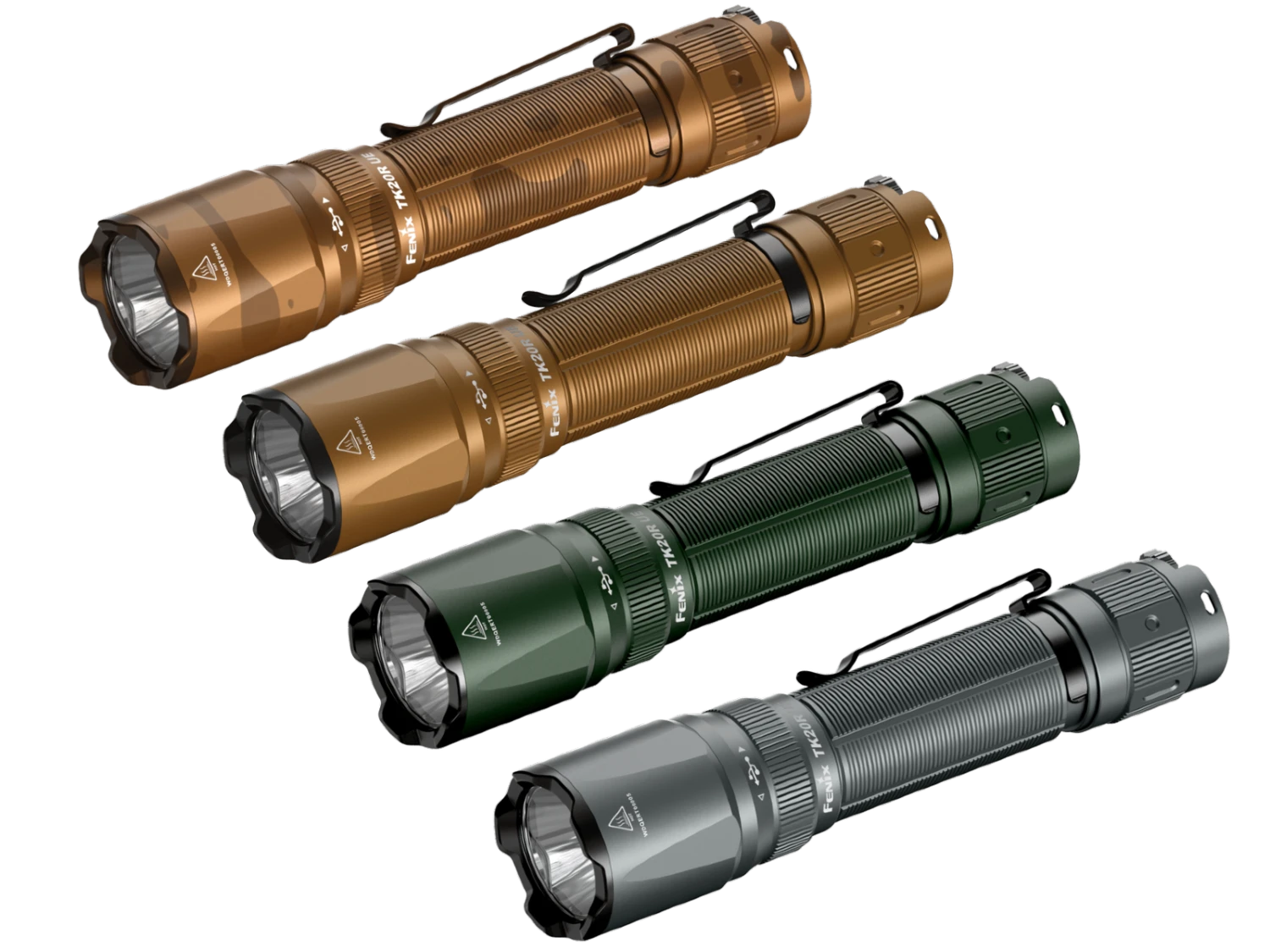 The Fenix TK20R UE Tactical Flashlight is an essential tool, offering a maximum output of 2800 lumens and 53,880 candela that ensures a reliable nighttime search and defense. With two modes – Tactical and Duty – and the ability to memorize and recall the last output and Strobe, it’s easy to operate with just one hand using the new FlexiSensa control toggle. The battery compartment features a double spring design that absorbs external impacts and ensures uninterrupted power while the sleek design is available in four colors – Desert Camo, Tan, Tropic, and City Gray.